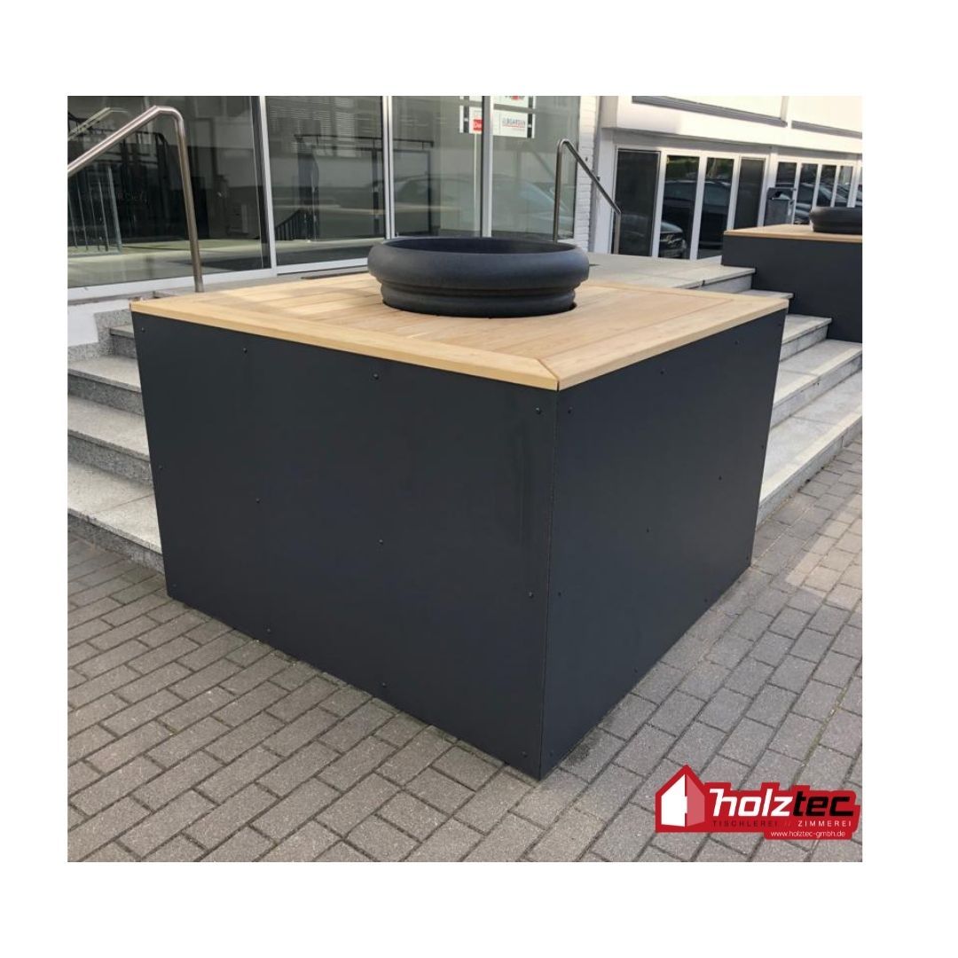 Mit einer Kombination aus sibirischer Lärche und Fassadenplatten in RAL 7016 haben wir für den Eingang dieses Bürokomplexes 2 Pflanzkübel hergestellt. Die Kübel sind an den Lauf der Treppe angearbeitet und wurden im Nachgang bauseits bepflanzt.